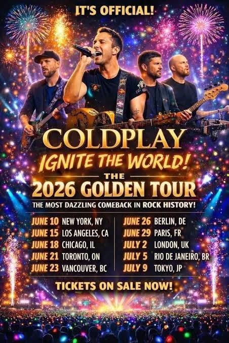 Coldplay are officially back on the global stage, and the excitement is already reaching fever pitch. The iconic British band—Chris Martin, Jonny Buckland, Guy Berryman, and Will Champion—have announced an expansive Global Tour 2026, marking one of the most ambitious chapters in their legendary career. More than just a concert series, the tour is being hailed as a worldwide celebration of music, unity, sustainability, and emotional connection, reaffirming Coldplay’s status as one of the most influential bands of their generation.